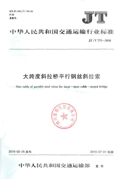JTT 775-2010 大跨度斜拉橋平行鋼絲斜拉索